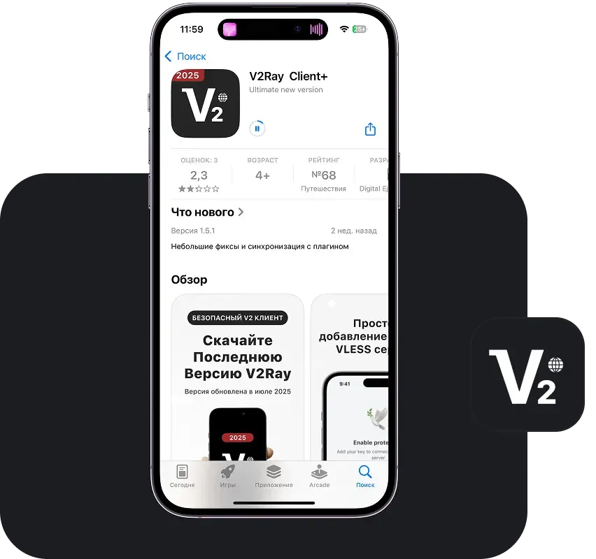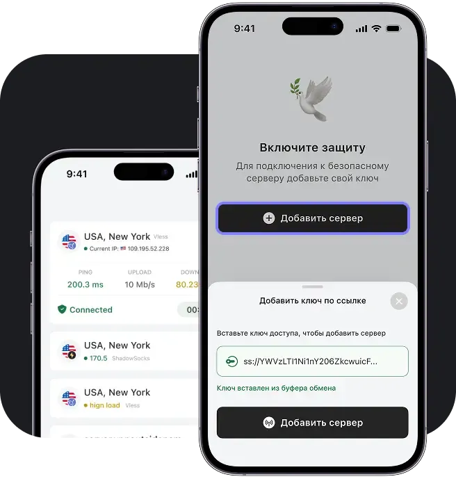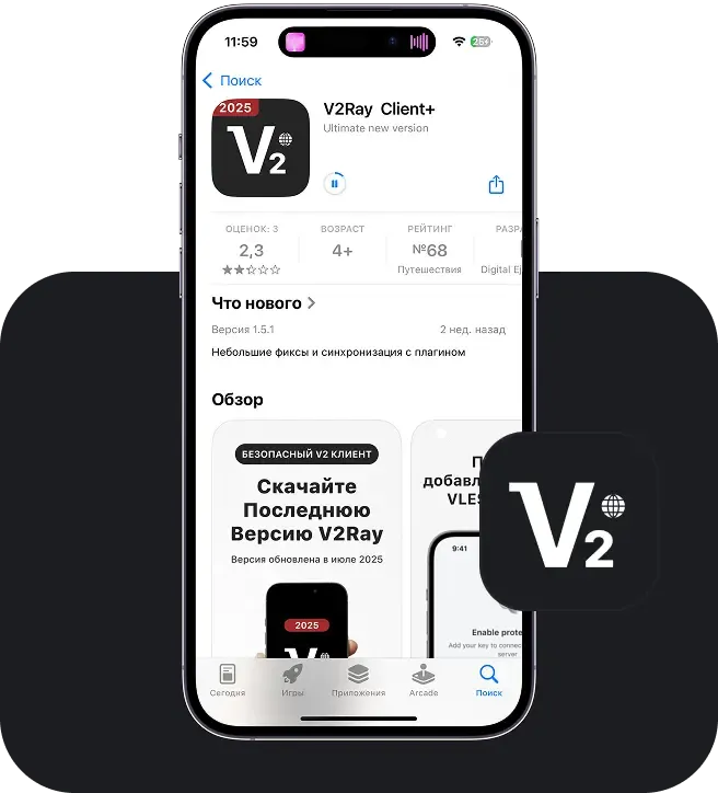 Загрузите приложение V2Ray, чтобы подключиться к VPN, добавив ключ конфигурации.