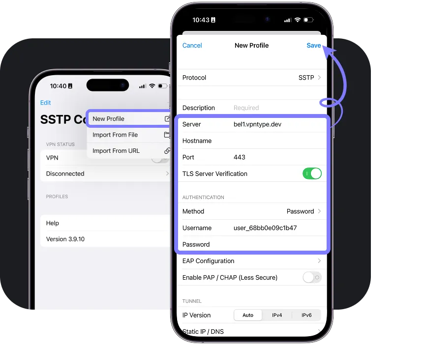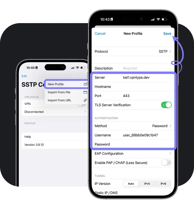 Для IOS: Нажмите на + в правом верхнем углу, а затем выберите создание нового профиля. Введите полученные на нашем сайте данные в соотвествующие поля и нажмите “save”, сервер добавится в приложение.
